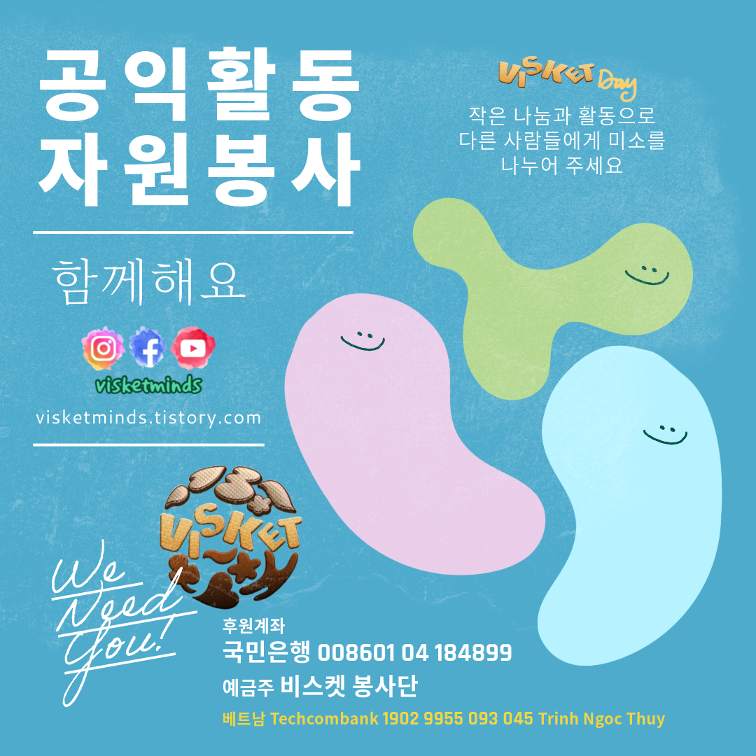 단체 비스켓 봉사단 (VISKET 봉사단) 활동을 2009년에 시작을 하여 베트남 하노이와 호찌민시 에서 매달 정기적인 오프라인 대면 공익활동을 하고 있는 중 입니다.